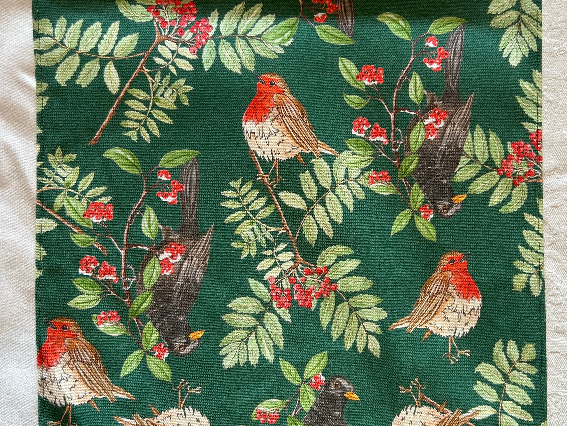 For the table runners and cloths, I have designed the print to be bi-directional. The picture can be looked at from either end of the table. The pattern includes my watercolours of Blackbirds, Robins and Rowans, printed on 100% organic cotton and hand finished.